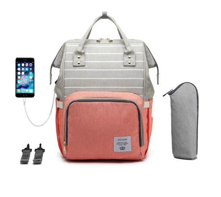 СУМКА-РЮКЗАК ДЛЯ МАМЫ LEQUEEN С USB (серый-коралловый, полоска)